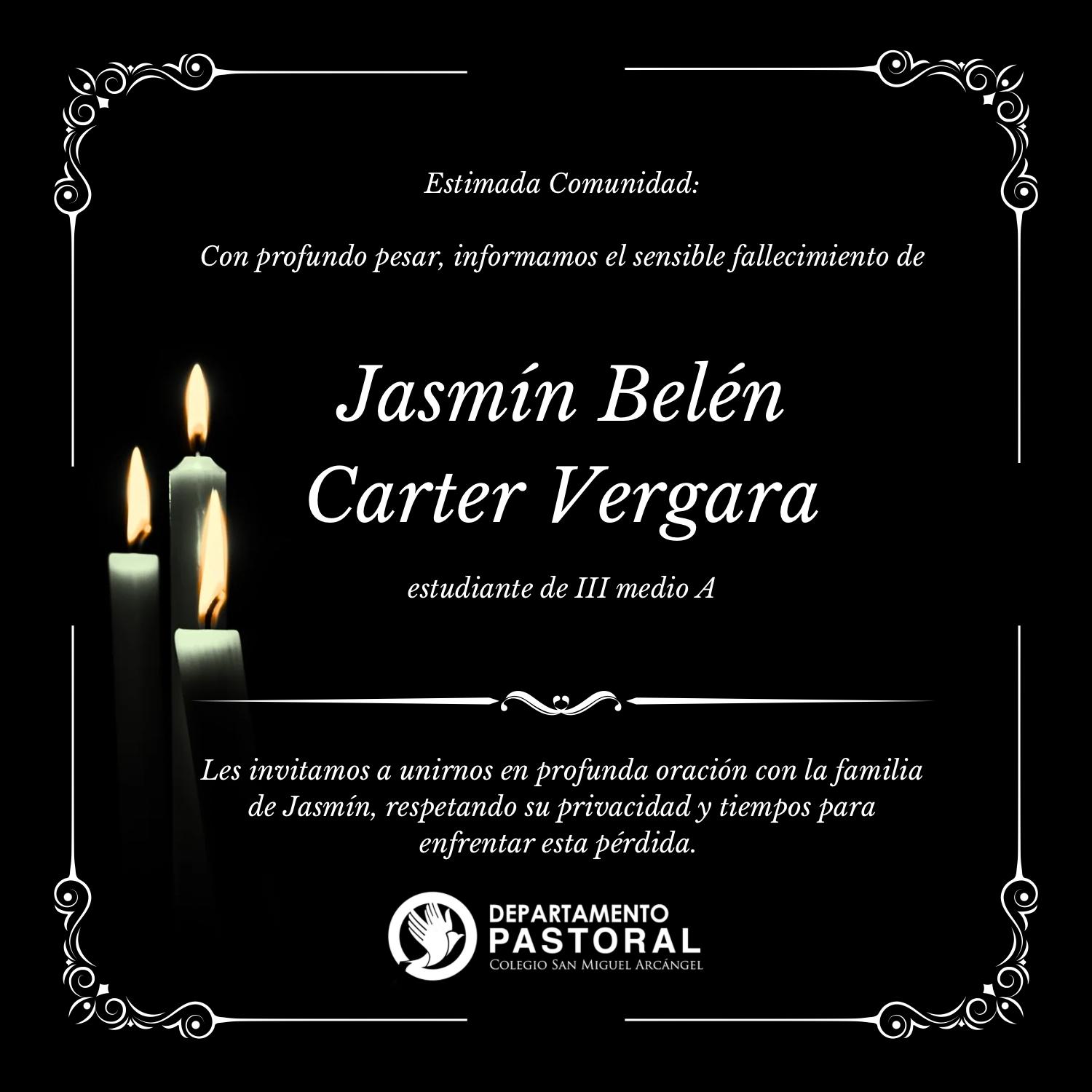 Con el corazón lleno de tristeza, informar a nuestra comunidad educativa que, en el día de hoy, ha fallecido Jasmín Belén Cárter Vergara, estudiante de 3° Medio, de nuestro Liceo Bicentenario San Miguel Arcángel.