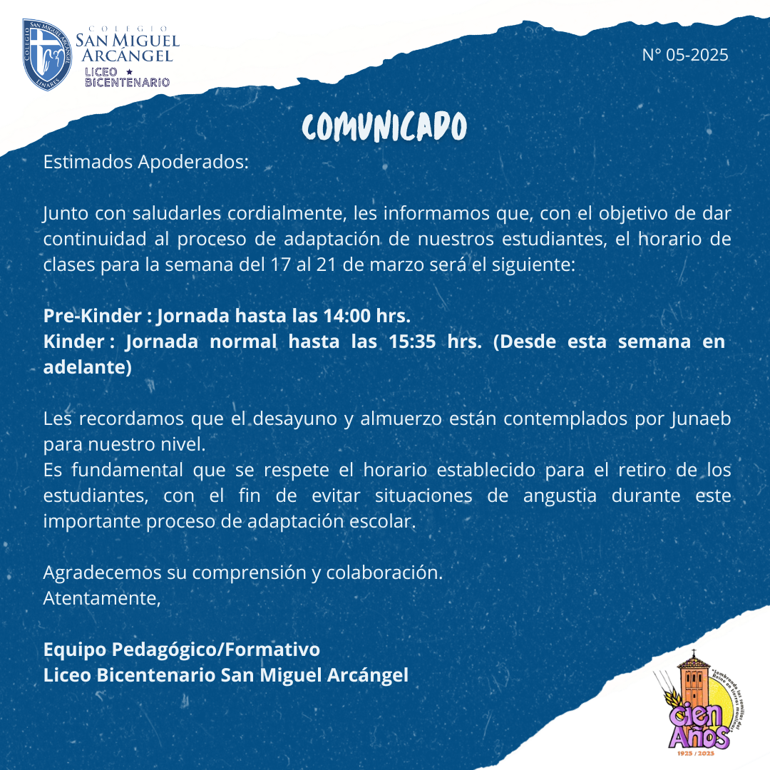 Kinder : Jornada normal hasta las 15:35 hrs. (Desde esta semana en adelante)