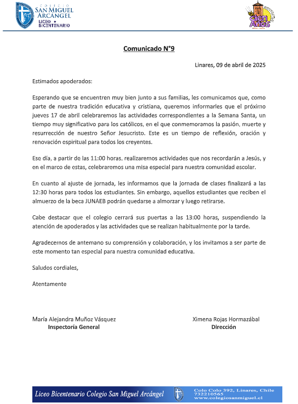 En cuanto al ajuste de jornada, les informamos que la jornada de clases finalizará a las