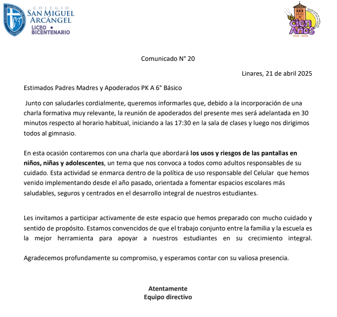 charla formativa muy relevante, la reunión de apoderados del presente mes será adelantada en 30