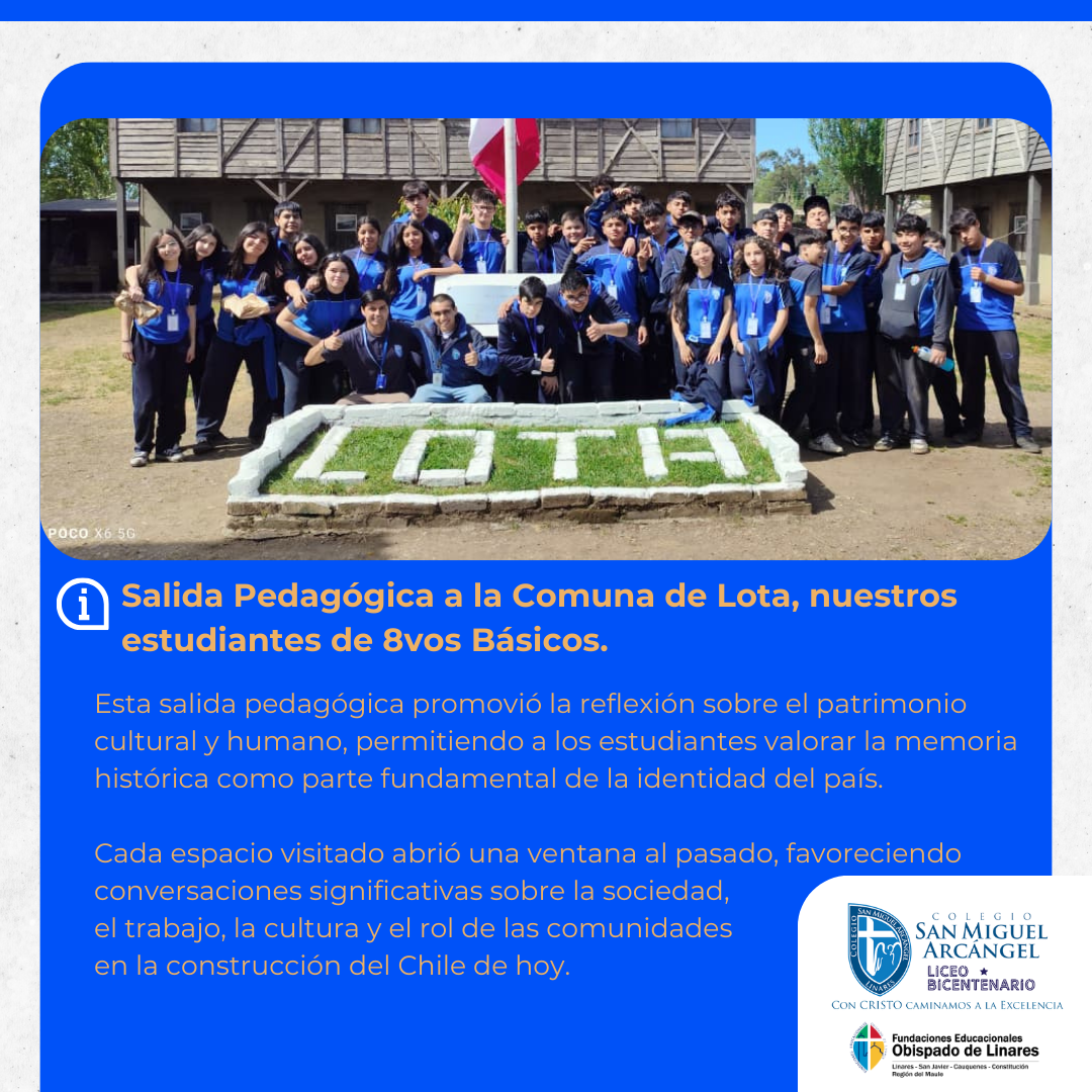 Nuestros estudiantes de 8° básico participaron en una significativa salida pedagógica a la comuna de Lota, donde tuvieron la oportunidad de recorrer el completo circuito educativo que abarca lugares emblemáticos de la historia y el patrimonio del sur de Chile. La jornada incluyó la visita al Parque Isidora Cousiño, el Museo Histórico de Lota, la mina El Chiflón del Diablo, el Pueblito Minero y el Pabellón 83, espacios que reflejan la vida y el legado de las antiguas comunidades mineras.