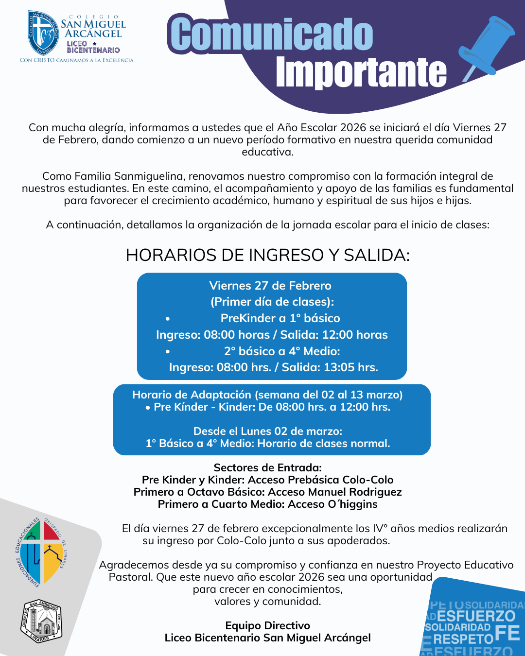 Agradecemos desde ya su compromiso y confianza en nuestro Proyecto Educativo Pastoral. Que este nuevo año escolar 2026 sea una oportunidad para crecer en conocimientos,